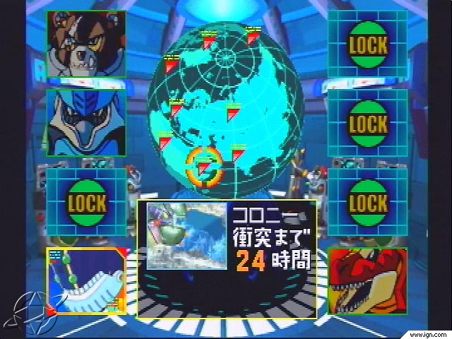 The story behind X5 explains its focus on time-based gameplay. Apparently, Sigma diverts a asteroid space colony to hit Earth, and X and Zero have just 48 hours to save the world before it hits. From looking at the select screen, the enemies seem to include a bear, a T-rex, a squid(?) and a whale(?). Or something like that. |